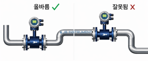 직관부 거리 확보: 부분적으로 개방된 밸브의 하류에 유량계를 설치할 때는 밸브로부터 최소 $10D$ 이상의 직선 파이프 구간(직관부)을 확보해야 합니다.