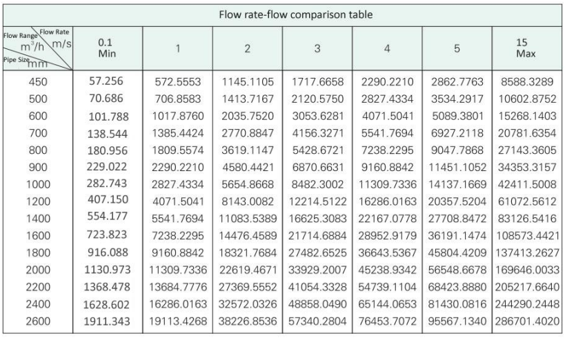 4. 유량 Q(m³/h)를 알고 있는 경우, 해당 직경에서 유량 1m/s에 해당하는 유량 Q를 표에서 찾으면, 해당 유량 V=Q/Q(m/s)로 계산할 수 있습니다.