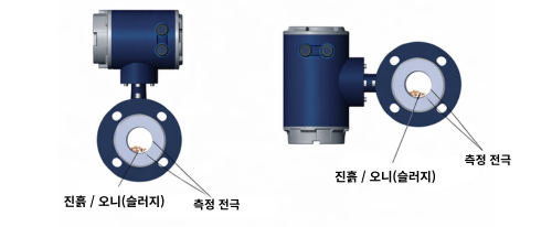 전도성 유체가 파이프 축을 따라 흐르면 자기장 선을 가로지르면서 유도 기전력이 발생하고이 기전력이 전극에 의해 감지됩니다.