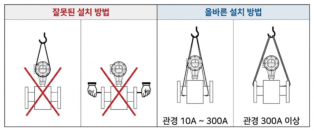 유지보수 권장 사항: 안정적인 설치를 위해 유량계 양쪽에 지지대(Supports)를 배치하십시오.